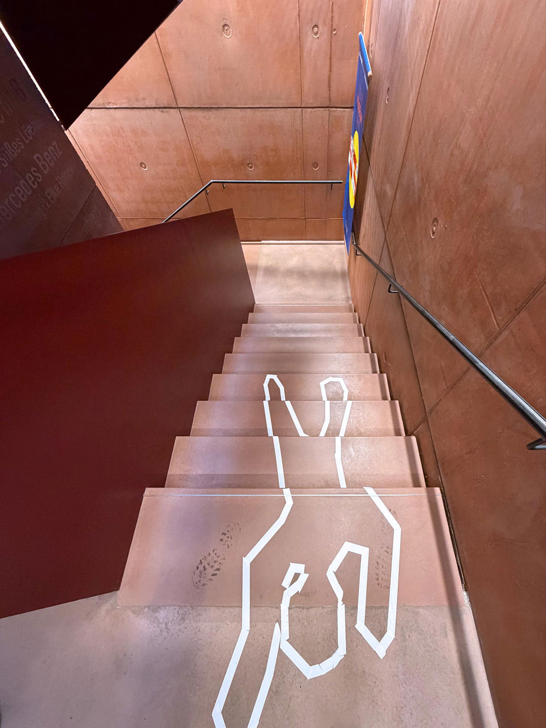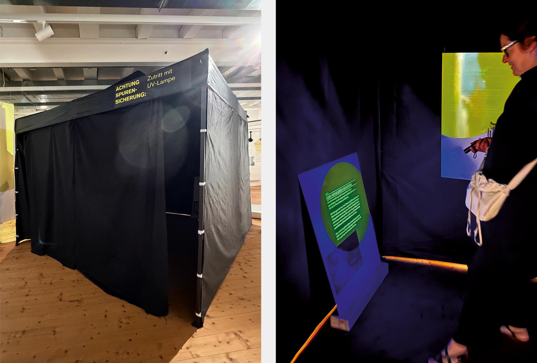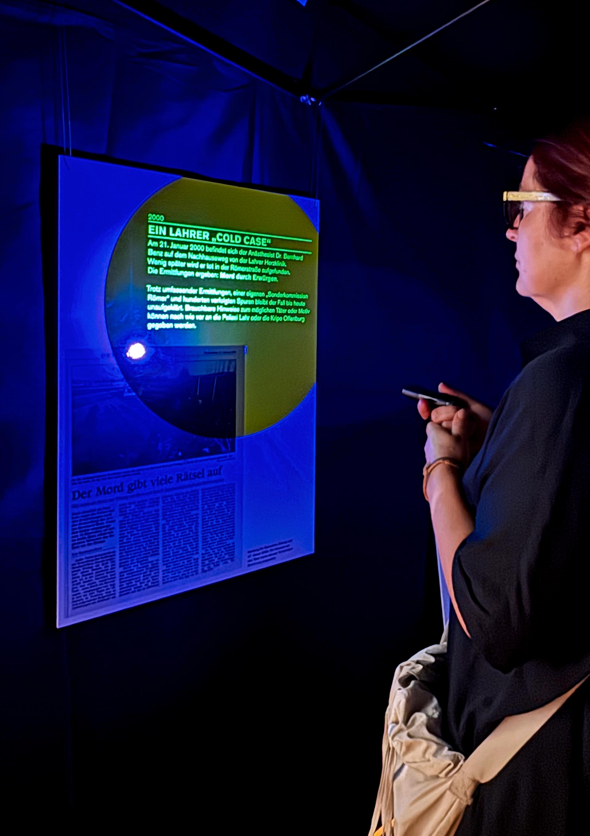 Leitmotiv ist die Spurensuche: In einem forensischen Zelt können Besucherinnen und Besucher mittels UV-Licht verborgene Hinweise entdecken und Fälle selbst „aufklären“. Makaber aber wegweisend zeigen die weiße Umrisse von Opfern den Weg durch die Ausstellung. Bereits zum fünften Mal seit 2022 gestalten wir ein Konzept für das Museum in der Tonofenfabrik.