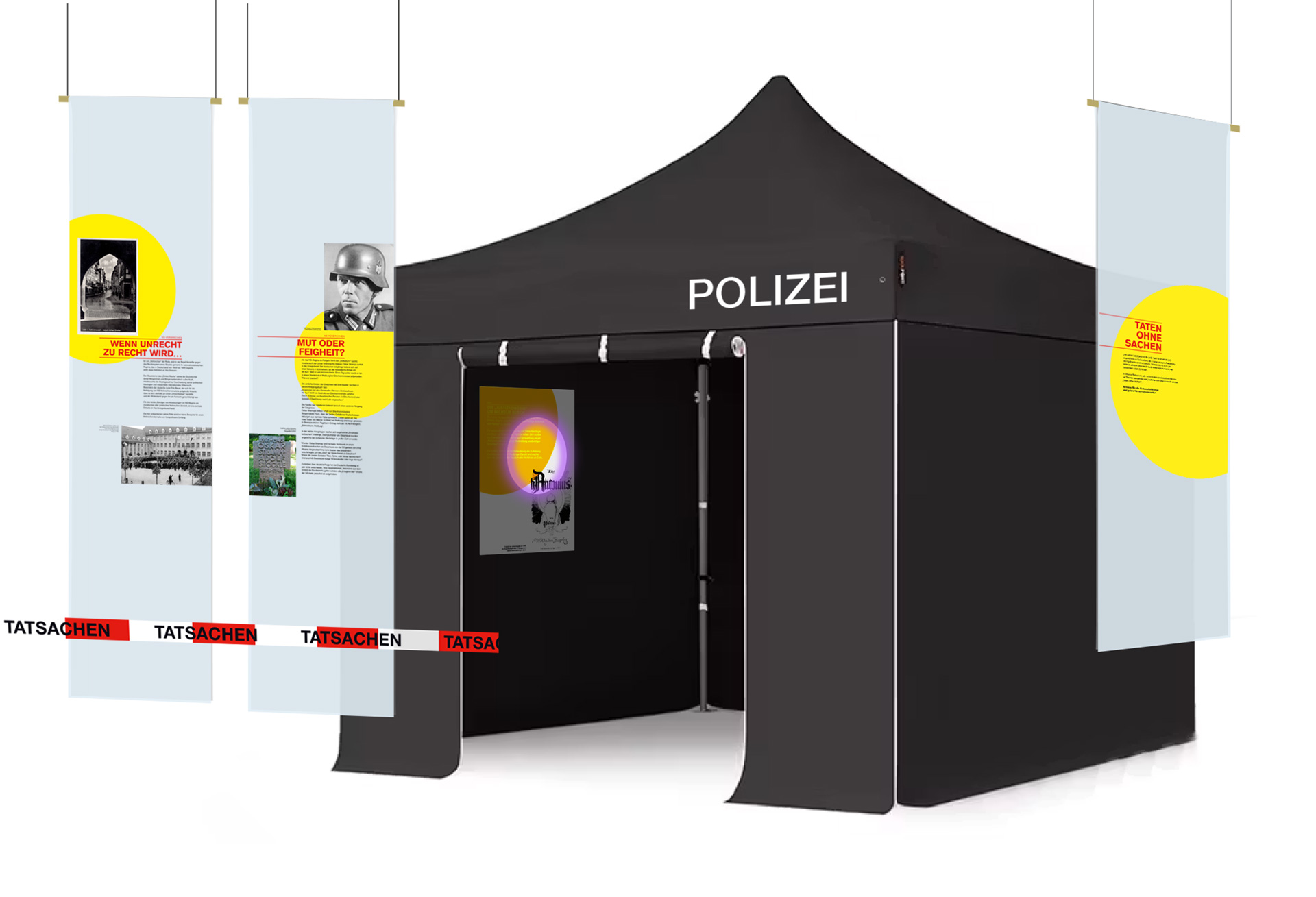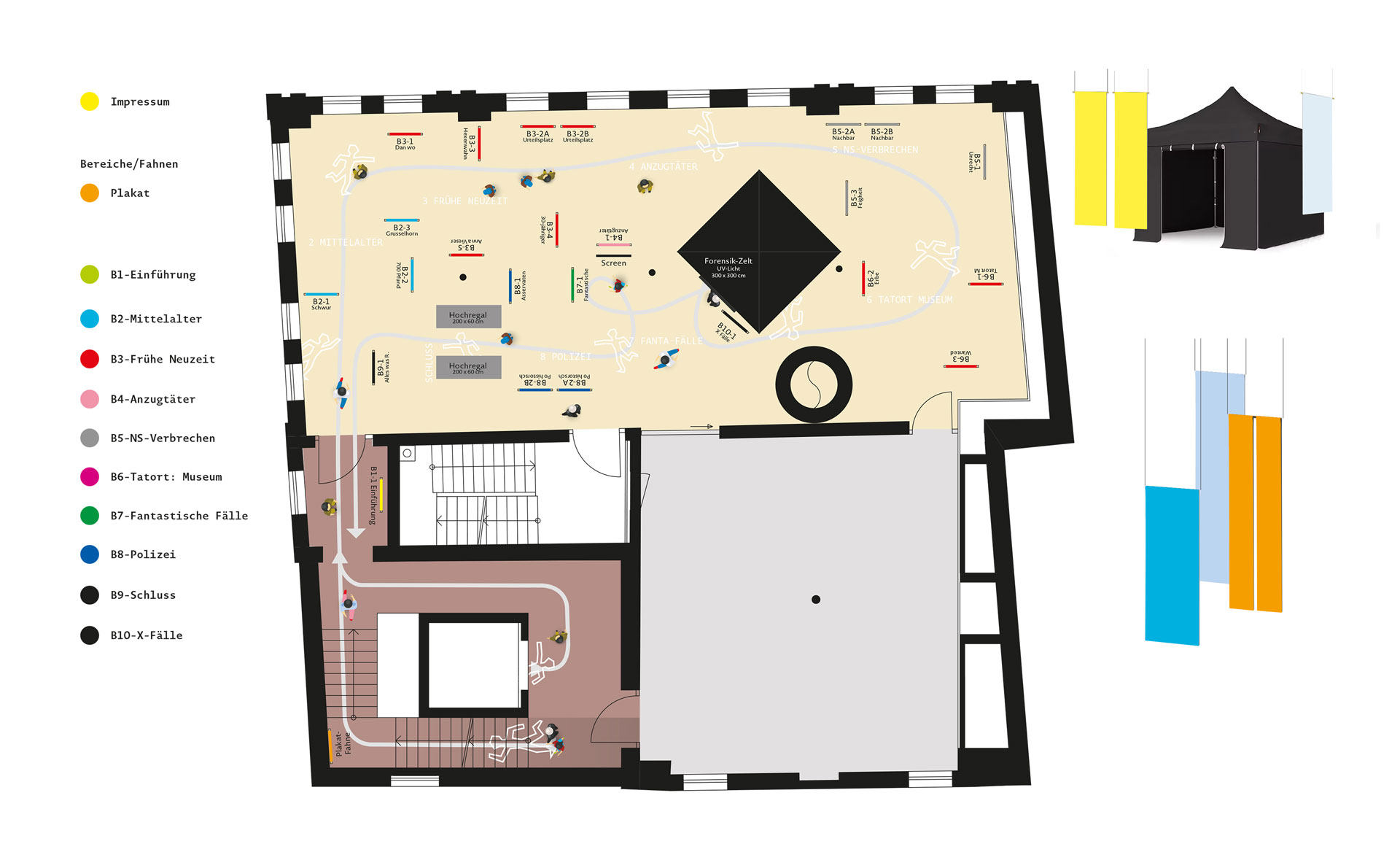 Leitmotiv ist die Spurensuche: In einem forensischen Zelt können Besucherinnen und Besucher mittels UV-Licht verborgene Hinweise entdecken und Fälle selbst „aufklären“. Makaber aber wegweisend zeigen die weiße Umrisse von Opfern den Weg durch die Ausstellung. Bereits zum fünften Mal seit 2022 gestalten wir ein Konzept für das Museum in der Tonofenfabrik.